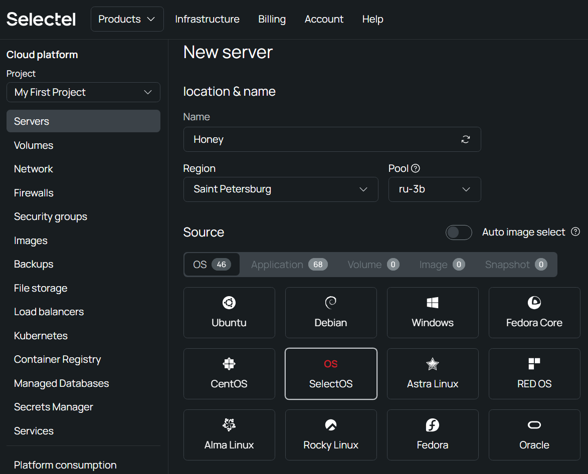 SelectOS is available for deployment within Selectel’s cloud platform and can be used when creating virtual machines. From a technical perspective, the process follows the standard flow of image selection and configuration — without manual assembly or custom builds from scratch: