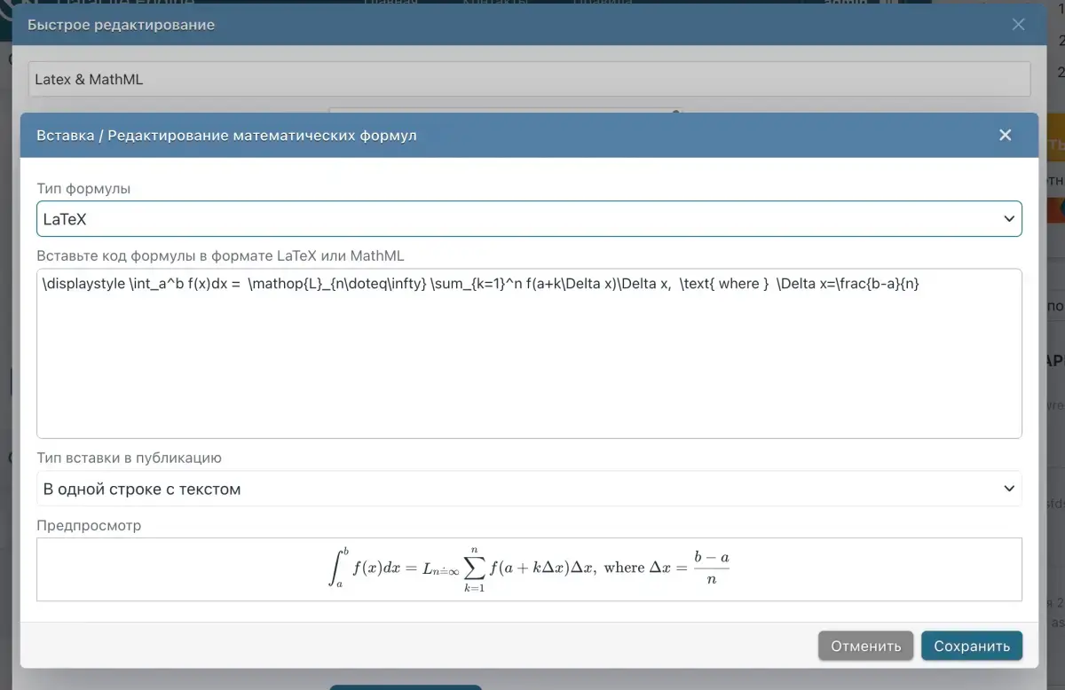 Редактор публикаций заметно расширил свои возможности. В систему добавлена поддержка математических формул с предпросмотром — через LaTeX или нативный MathML, с рендерингом KaTeX там, где это нужно. Скрытые блоки и спойлеры теперь оформляются нативными HTML-элементами, что упрощает их редактирование и перемещение по тексту без танцев с тегами.