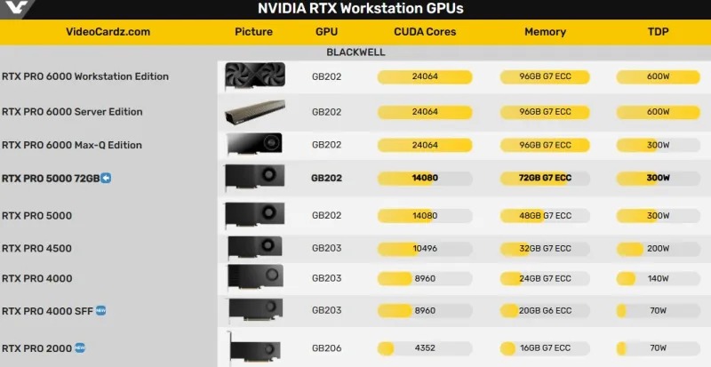 Компания Nvidia снова решила, что громкие анонсы — не её стиль. Без пресс-релизов и фанфар она выпустила новую версию профессиональной видеокарты RTX Pro 5000 Blackwell, которая отличается от прежней лишь одним, но заметным параметром — объёмом видеопамяти. Теперь это не 48, а 72 Гбайт.