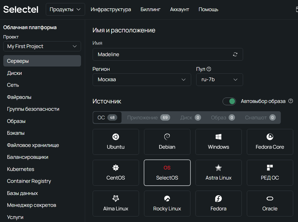 SelectOS доступна для развёртывания в облачной платформе Selectel и может использоваться при создании виртуальных машин. С технической точки зрения это привычный процесс выбора образа и конфигурации, без сложных ритуалов и ручной сборки системы с нуля, который занимает считанные на пальцах одной руки минуты: