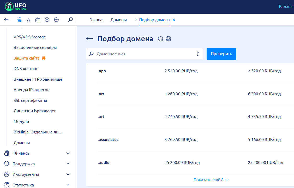 Пользователям доступен выбор из более чем сотни популярных и нишевых доменных зон: от классических .com и .ru до более редких .shop, .dev и .online. После выбора домена его можно моментально оплатить и привязать к своему хостингу или новому проекту.
